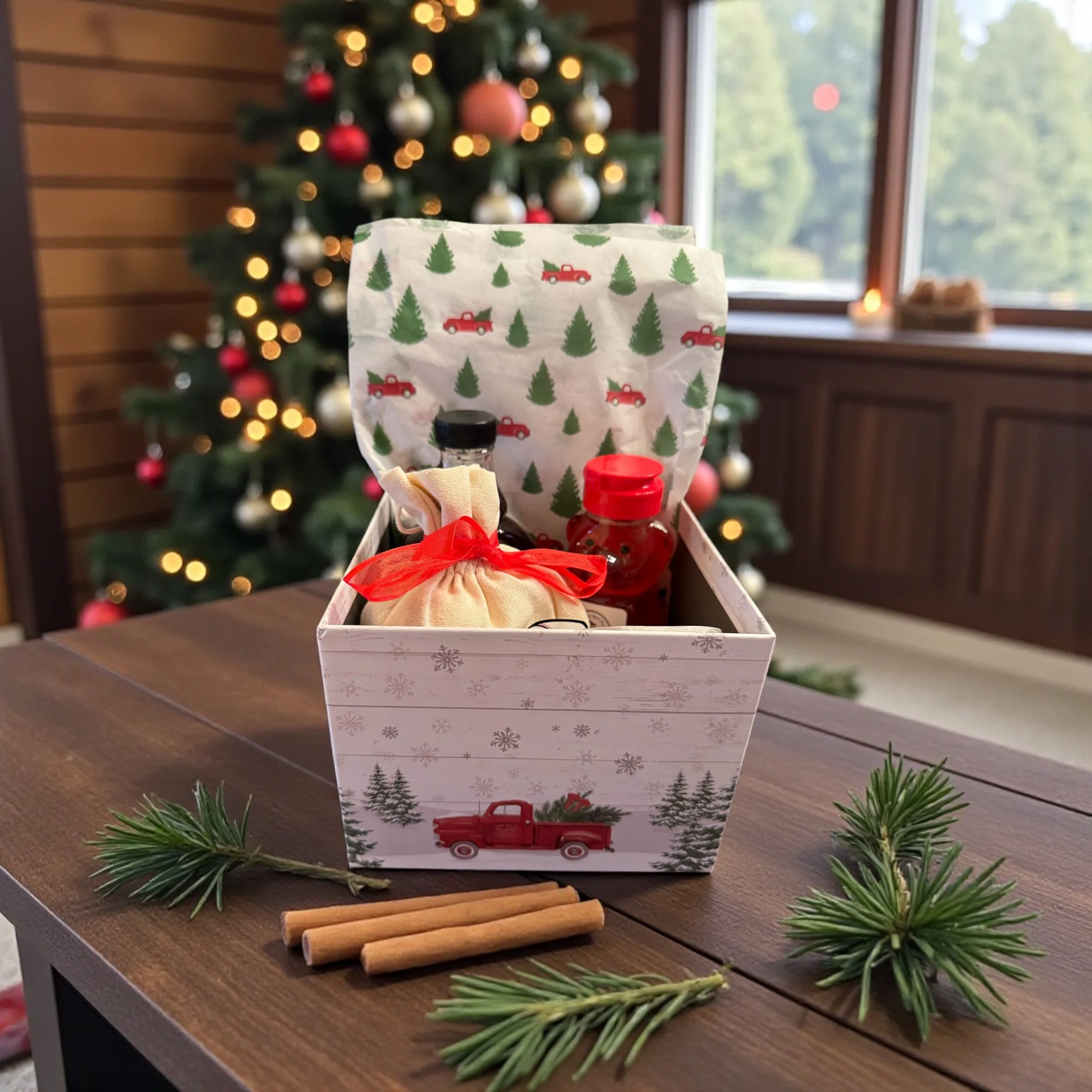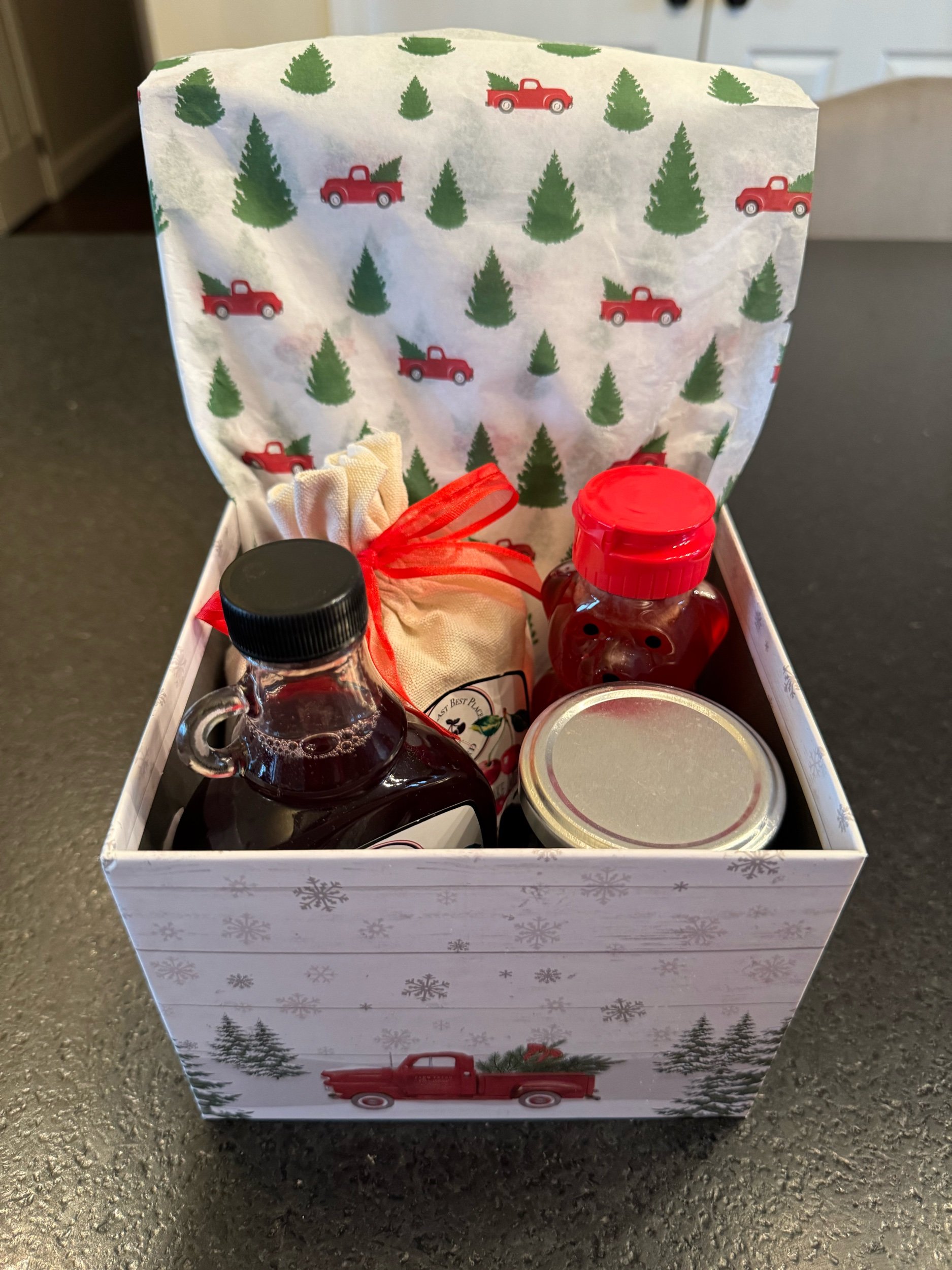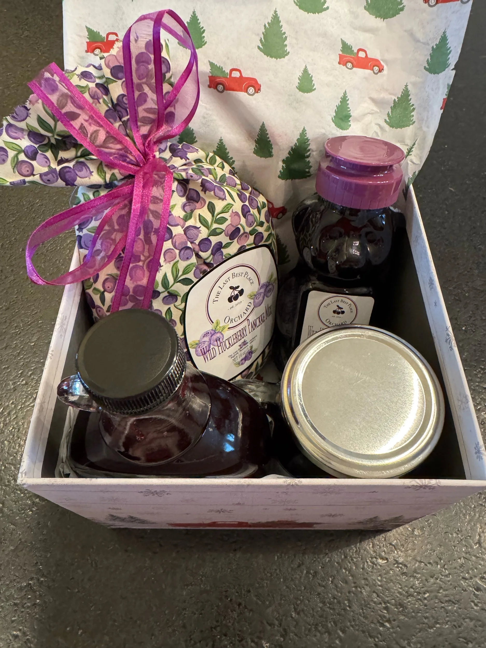 This classic box contains 4 items - Pancake Mix, Large Jam, Honey and Syrup in Flathead Cherry or Huckleberry flavors. Packaged in either Festive Red Truck box for local delivery or White Mailer box for shipping.